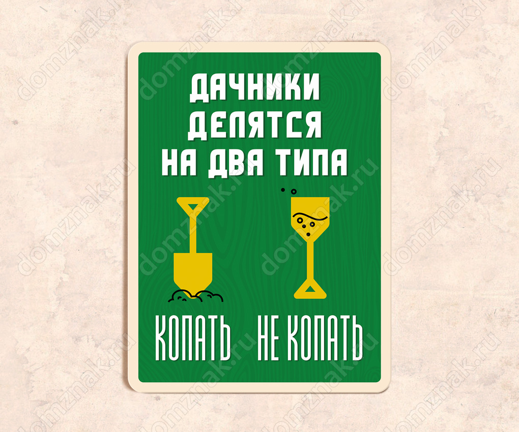 Табличка «Дачники делятся на вида типа: копать, не копать.» изготовлена из пластика ПВХ, толщиной 4 мм. Изображение наносится по технологии УФ-печати. Табличка предназначена для использования как в помещении, так и на улице.